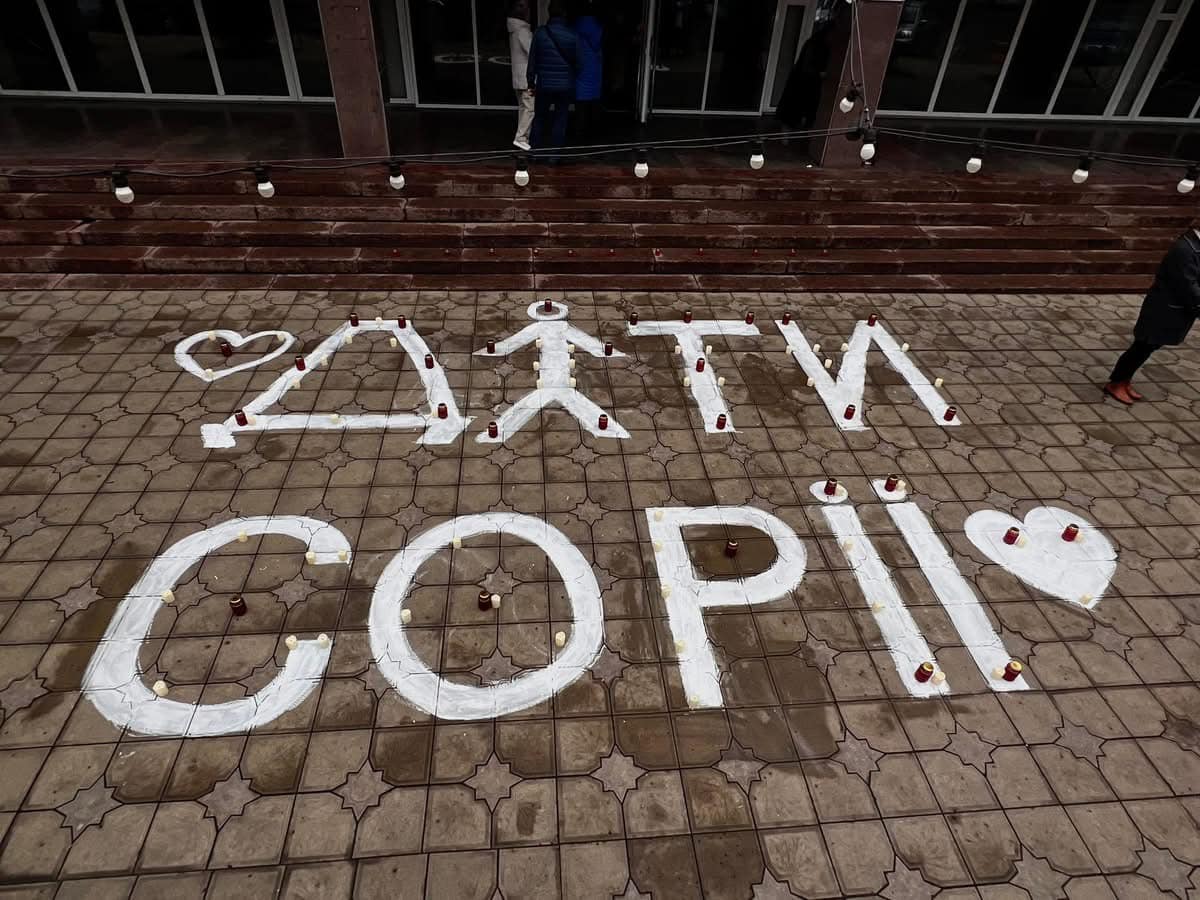 Actorii din Mariupol împreună cu cei de la Teatrul fără Nume au pictat în alb cuvântul „Дiти” - copii - și au depus candele. Ulterior, aceștia au ținut un minut de reculegere pentru victimele din Mariupol și au scandat: „Slavă Ucrainei!".